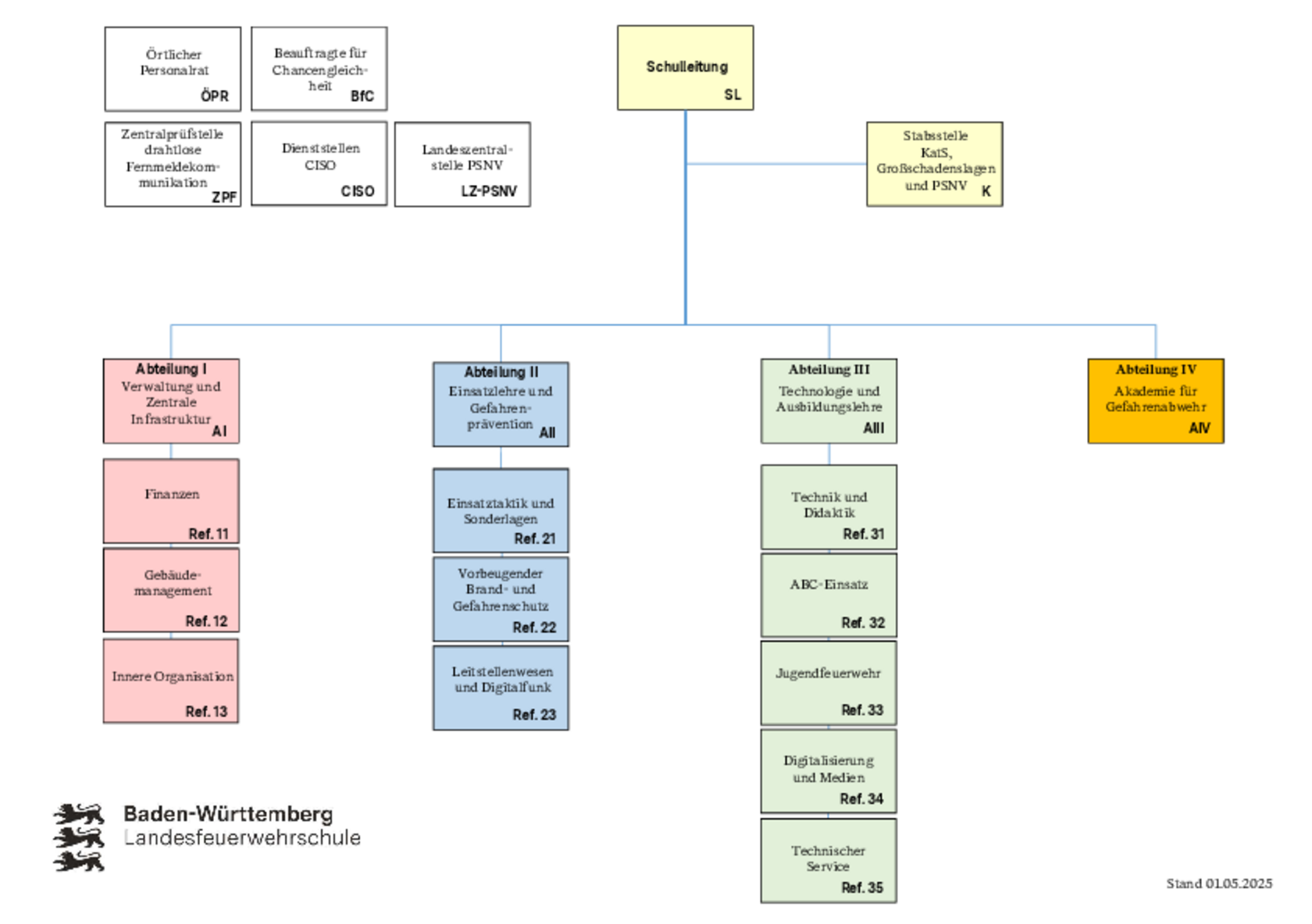 Die Landesfeuerwehrschule ist in verschiedene Stabsstellen, Abteilungen und Referate gegliedert, die bestimmte Querschnitts- und Fachaufgaben übernehmen.